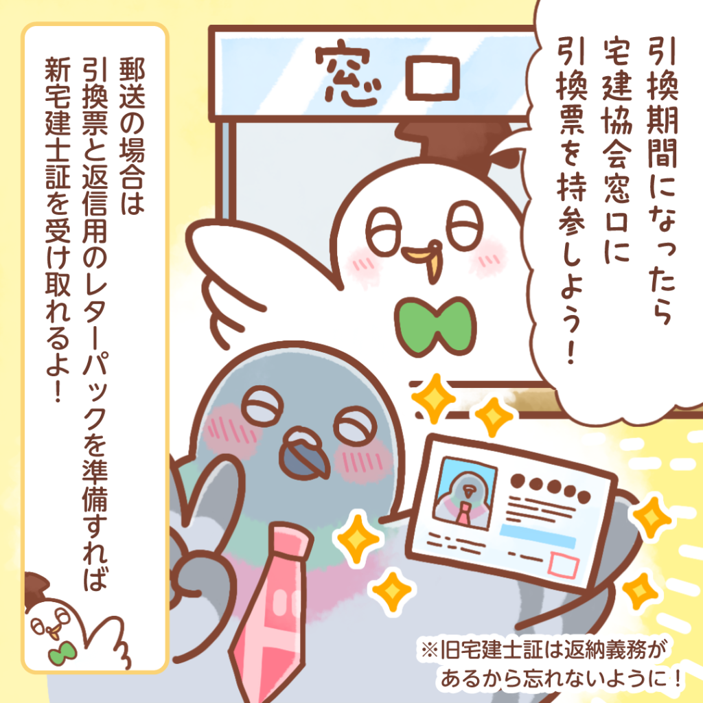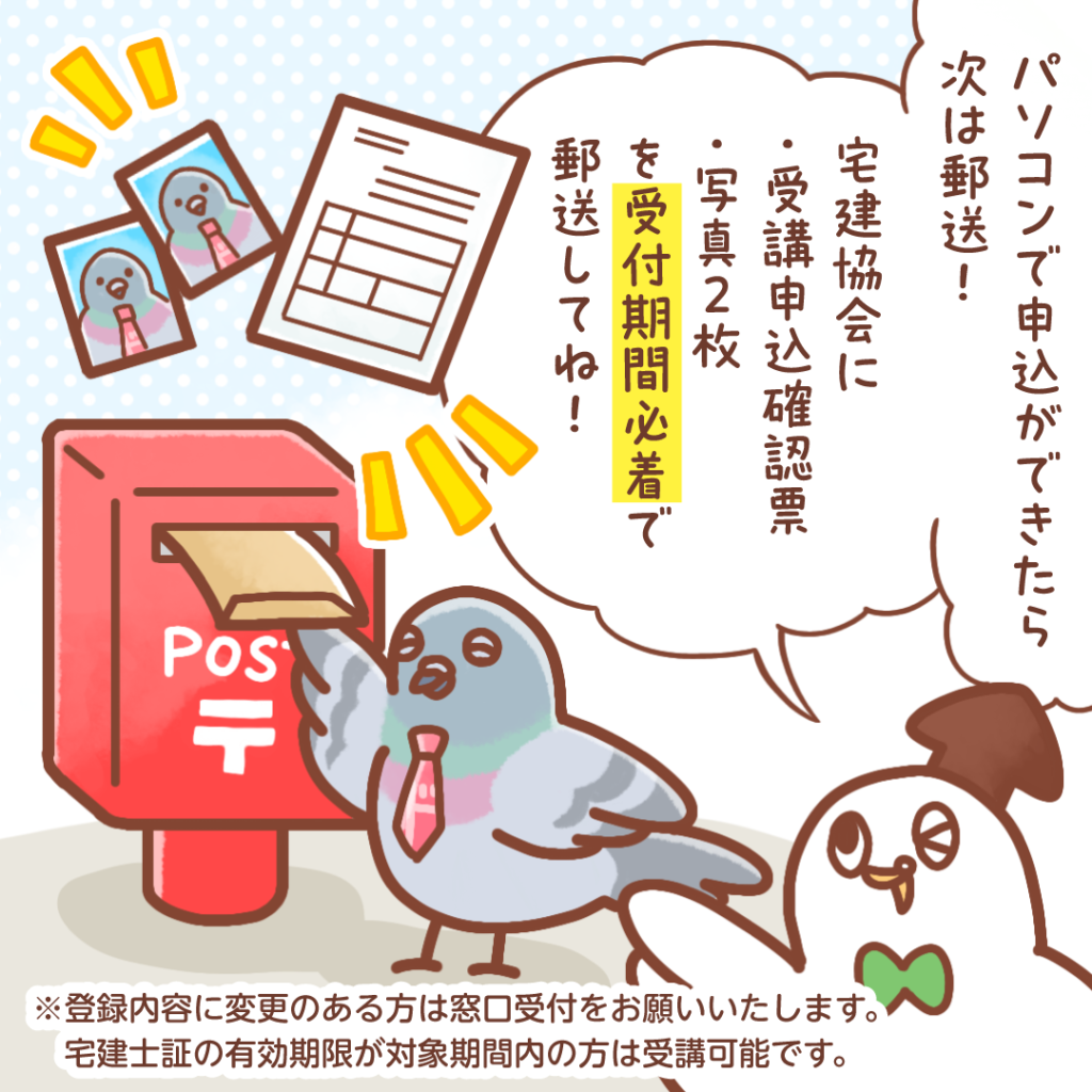 | プリントアウトした受講申込確認票と 証明写真(縦3cm×横2.4cm)2枚を郵送 | 必要書類 ・宅建士証交付申請書 ・使用料(手数料)納入票 ・証明写真(縦3cm×横2.4cm)2枚 ・変更届(変更ありの方のみ) ・宅建士証(更新の方のみ) |