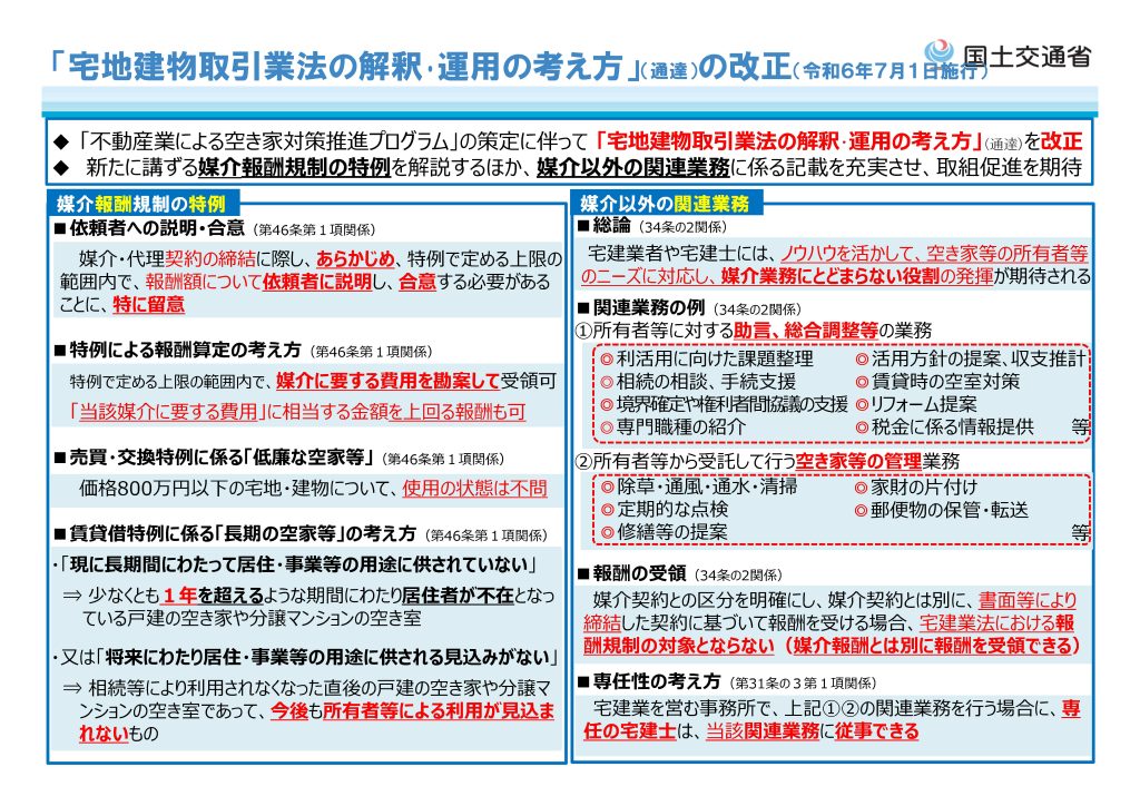 媒介報酬及び解釈・運用の考え方の一部改正 2024.07.01 令和6年6月21日公布、令和6年7月1日施行 会員業者におかれましてはハトサポ > ワード・エクセル契約書式 > 媒介契約書 > 宅建業法に基づく報酬額告示表よりダウンロード・印刷し、改正後の報酬額表へ差し替えをお願いいたします。 前の記事へ 次の記事へ