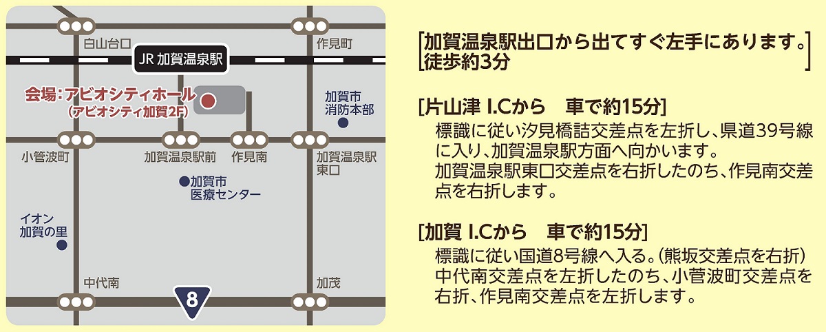 | 会 場 | アビオシティ加賀 2階「アビオシティホール」 加賀市作見町ル25-1 TEL:0761-72-5545 |